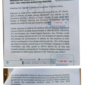 National: The Uganda Professional Humanities Teachers’ Union (UPHTU) has warned government that Arts and Humanities teachers may resume industrial action if the presidential directives on salary harmonization and other welfare commitments are not implemented in the ongoing 2026/2027 to 2030/2031 budgeting process. In a letter dated March 11, 2026, addressed... Read More
