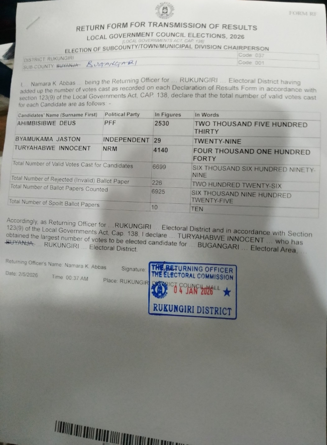 Rukungiri: Innocent Turyahabwe, popularly known as Kaino, of the National Resistance Movement (NRM), has been declared the duly elected LC3 Chairperson for Bugangari Sub-County in Rukungiri District.
