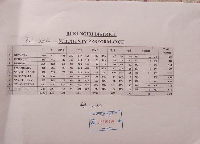 Sub-County Performance: Only 297 Pupils Fail 2025 PLE Exams in Rukungiri District